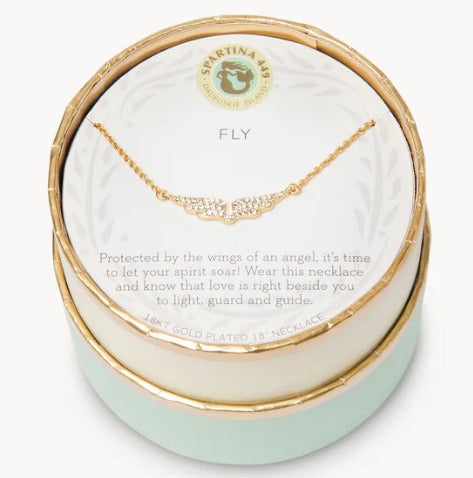 Wear our Fly Necklace as a reminder to soar. Featuring a wings charm, this special piece comes packaged inside a beautiful box with the message: "Protected by the wings of an angel, It's time to let your spirit soar! Wear this necklace and know that love is right beside you to light, guard and guide."