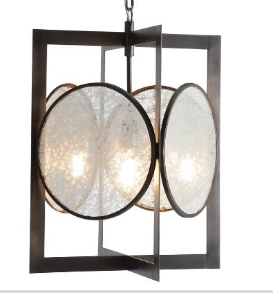 The glass version of the Clove Pendant is a fresh take on Arts and Crafts Style. The rubbed bronze finish on the intersecting rectangular frames draws out the darker tones in the discs of Mercury Glass, which warm the illumination as light passes through them. The implied lantern-shape makes this a nice choice for a modern farmhouse aesthetic.