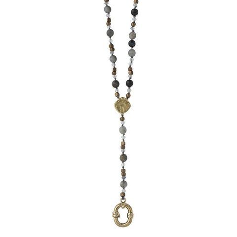 A mindful take on a beloved design, y-necklaces are time-honored favorites that are flattering and feminine. Our Evolution Y Necklace is composed of luminous, faceted, natural stones, hand-knotted and finished off with our signature brass Orbit Charm Catcher for displaying your favorite charms and pendants. Available in two versions: labradorite and moonstone or opal, both accented with a diamond-shaped hammered brass icon at center and discs throughout the strand. Measures 25.5” with 3.5” drop. Brass, Labradorite & Moonstone 3-6 MM | 25.5” + 3.5” DROP EVOL5BR-LAB