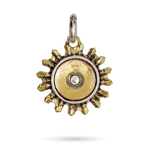 Forget your sorrows, and let your cares be dispersed by the fiery light of this agéd sun. Brassy geodes of light emanate out of a solid brass dome, edged in a coiled sterling silver band. This daystar’s watchful eye peers cheerfully through the lucid glow of a large crystal, encircled by carvings of oxidized rays. Could it be the most important thing we can remember, is to let ourselves forget? Forgetting, itself, is a part of memory. It is the way in which our minds sift, setting aside the staggering volume of daily happenings from memories to treasure. Named after the potion used in ancient times to induce forgetfulness, the Nepenthe Pendant will clear the distractions, increase concentration and creativity, and make note of only that which is most dear.