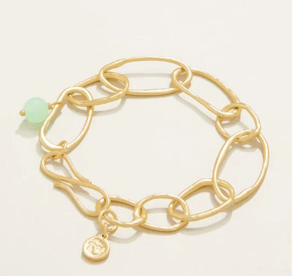 Inspired by the beauty of a flowing river, this custom chain with textured organic links plated in lustrous matte 18kt gold is the perfect layer for any wrist. Finished with a textured s-hook clasp and topped with a sea foam glass bead.