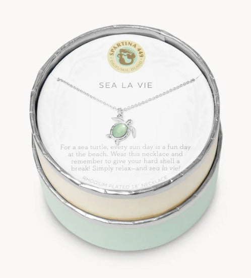Wear our Sea La Vie Necklace as a reminder to relax. Featuring a sea turtle charm, this special piece comes packaged inside a beautiful box with the message: "For a sea turtle, every sun day is a fun day at the beach. Wear this necklace and remember to give your hard shell a break! Simply relax - and sea la vie!"