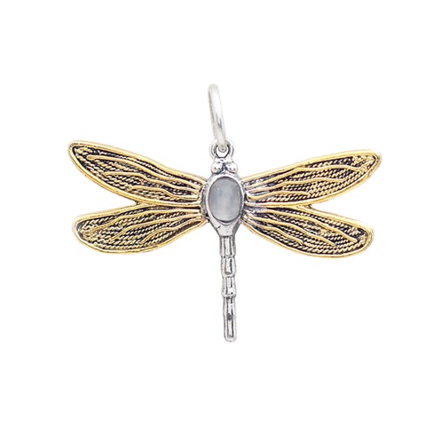 A glorious dragonfly symbolizing vibrance and light carries a brilliant moonstone within the sterling silver body of this flying friend. The sheen of marvelous brass creates the emergent expanse of wings. A stone for new beginnings, the moonstone is the perfect pairing to a creature all too familiar with supernatural alchemy, surprising discoveries and overnight realizations—persisting, always, to never forget the dream. For the dream is what transforms her.