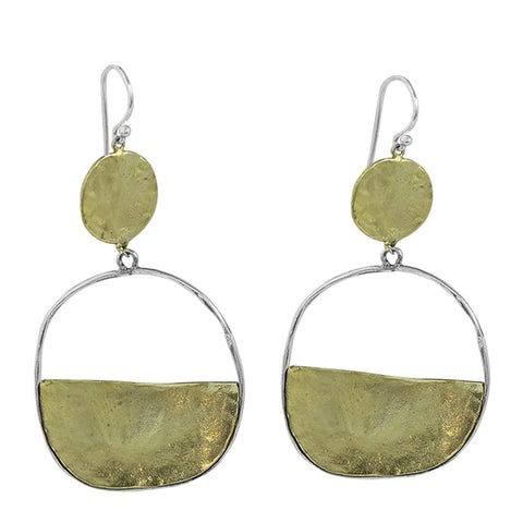 Every sunset promises a sunrise, and each new day promises a swath of adventures. Our Vista Earrings, with a literal horizon as a design focal point, promise to affirm your willingness to welcome wonder, to embrace optimism, and to encounter the world with openness and warmth. A half-disc of bright brass sits within an open sterling silver frame, and hangs from a smaller brass circle above. Outfitted with sterling silver French wire hooks, these earrings will gently sway when you tilt your head. Also available in an all-sterling silver option. Brass & Sterling Silver 2”